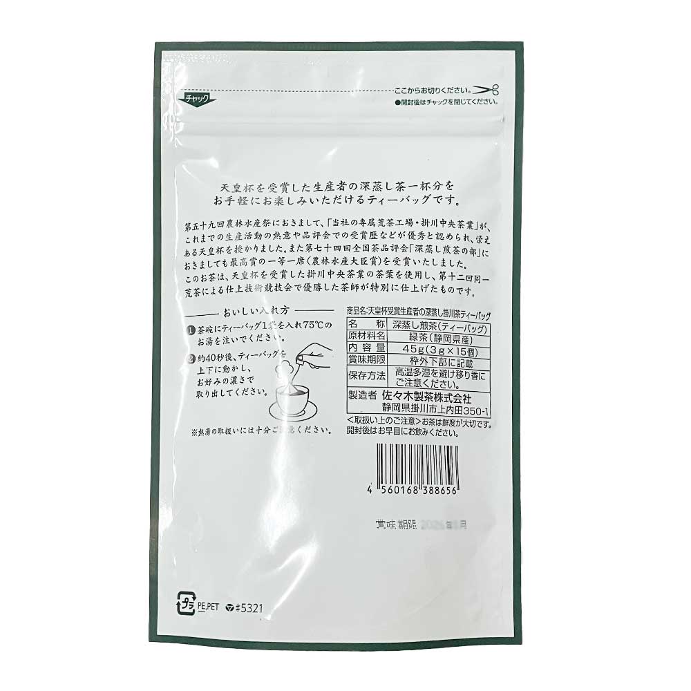 静岡県掛川の佐々木製茶さんのティーバッグ緑茶(煎茶)です。品質はもちろん、茶師の技量や熱意、品評会での受賞歴等、総合的に評価され農林水産祭にて栄誉ある「天皇杯」を受賞しました。コクのある美味しいお茶に仕上がっています。