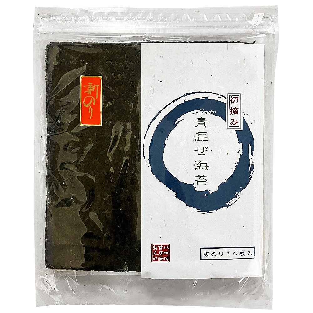 「青混ぜ(あおまぜ)」という海苔をご存知でしょうか?黒海苔に、香り高い「青のり」が自然に混ざって育った、とても希少な海苔です。火を入れることで際立つ青海苔の芳醇な香りと、若芽ならではのサクッとした歯切れの良さが特徴です。口に含むと瞬時にとろけ、独特のほろ苦さと甘みが複雑に絡み合います。