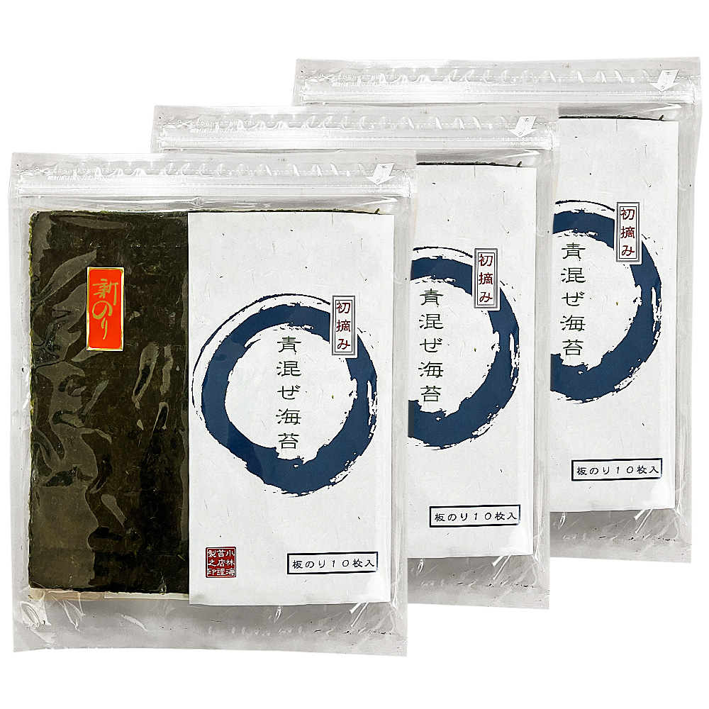 「青混ぜ(あおまぜ)」という海苔をご存知でしょうか?黒海苔に、香り高い「青のり」が自然に混ざって育った、とても希少な海苔です。火を入れることで際立つ青海苔の芳醇な香りと、若芽ならではのサクッとした歯切れの良さが特徴です。口に含むと瞬時にとろけ、独特のほろ苦さと甘みが複雑に絡み合います。